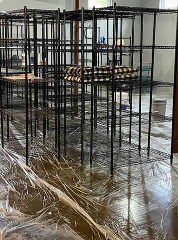 After treating basement concrete flooring with enzymes to remove cat urine odors, the basement floor is covered in plastic overnight to allow the enzymes to work without drying out.